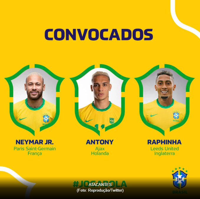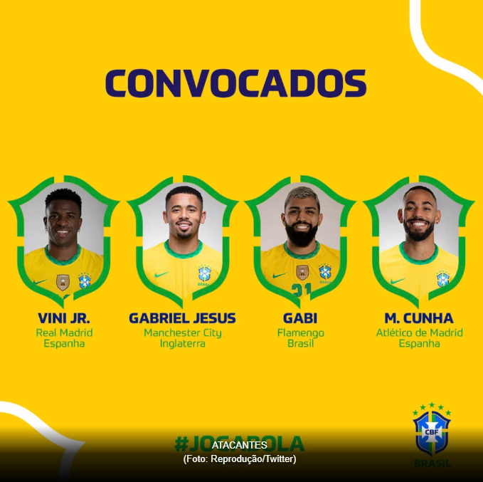 Atacantes: Neymar (PSG), Gabriel Jesus (Manchester City), Vinicius Jr (Real Madrid), Gabigol (Flamengo), Raphinha (Leeds United) e Matheus Cunha (Atlético de Madrid) e Antony (Ajax)