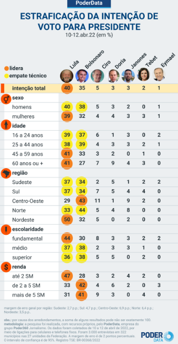 Pesquisa PoderData realizada de 10 a 12 de abril de 2022 mostra que o ex-presidente Luiz Inácio Lula da Silva (PT) tem 40% das intenções de voto para as eleições presidenciais de 2022, seguido pelo presidente Jair Bolsonaro (PL), com 35%.