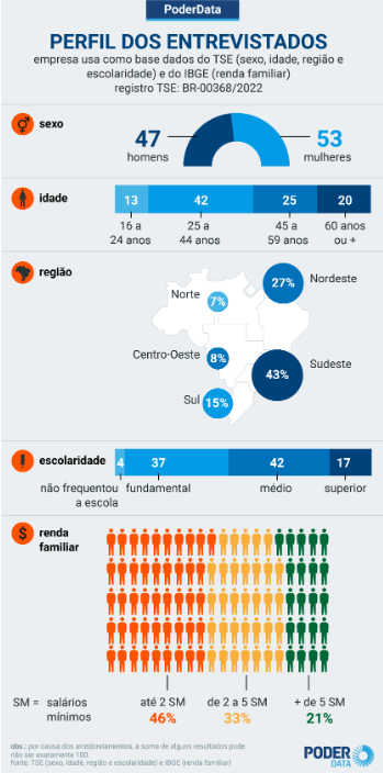 Para facilitar a leitura, os resultados da pesquisa foram arredondados. Devido a esse processo é possível que o somatório de algum dos resultados para algumas questões seja diferente de 100. Diferenças entre as frequências totais e os percentuais em tabelas de cruzamento de variáveis podem acontecer devido a ocorrências de não resposta. Este estudo foi realizado com recursos próprios do PoderData, empresa de pesquisas que faz parte do grupo de mídia Poder360 Jornalismo. A pesquisa está registrada no TSE sob o número BR-00368/2022.